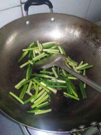 首先,将蒜苔洗净切成段,锅中加入适量油,放入蒜末爆香,然后加入蒜苔快速翻炒,加入适量盐、生抽、鸡精调味即可。